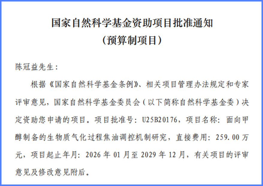 近日,国家自然科学基金委公布了2025年度国家自然基金企业创新发展联合基金重点支持项目评审结果,重点实验室主任陈冠益教授申报的“面向甲醇制备的生物质气化过程焦油调控机制研究”项目获批立项,资助直接经费259万元。